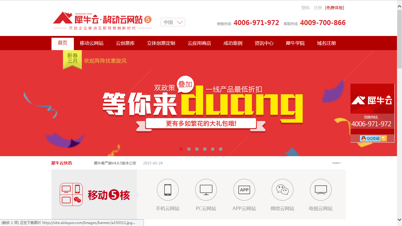 现在犀牛云移动云网站推出了产品展示型、企业官网型、外贸专业型、会员服务型、电商专业型。