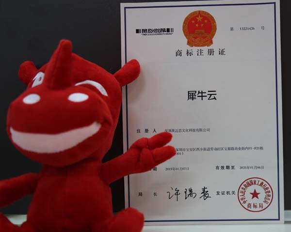 2015年3月3日,犀牛云事业部正式接收到由中华人民共和国国家工商行政管理总局颁发的关于“犀牛云”42类商标的商标注册证!自此,以“犀牛云”为注册商标的犀牛云旗下产品 网赢战车 将继续发力互联网,为广大企业开启移动互联网营销新时代!