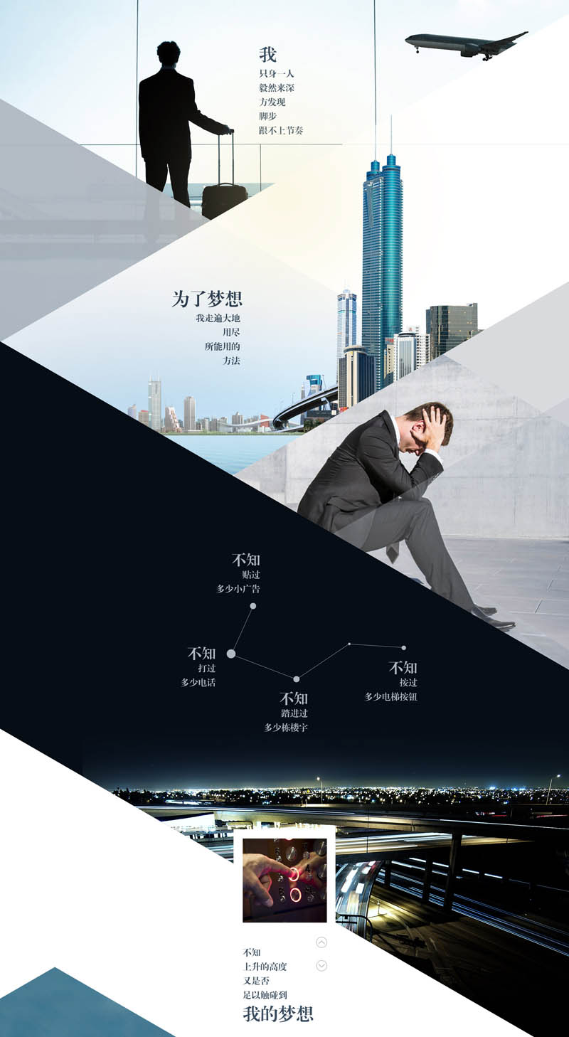 每一天,你满怀壮志,踏进电梯期待接下来的成功。按下楼层,仿似是在点亮自己的梦想一般。但失败而回,转身,带着梦想踏进电梯那一刻。独自一人搭乘着电梯,在这个狭小的空间,你的内心有在想着什么?挫败,是自己所坚信的梦想却没有得到认同,失落,是所坚信的梦想没有得到实现,无奈,是所坚信的梦想如何在才能找到更好的展现方式?!