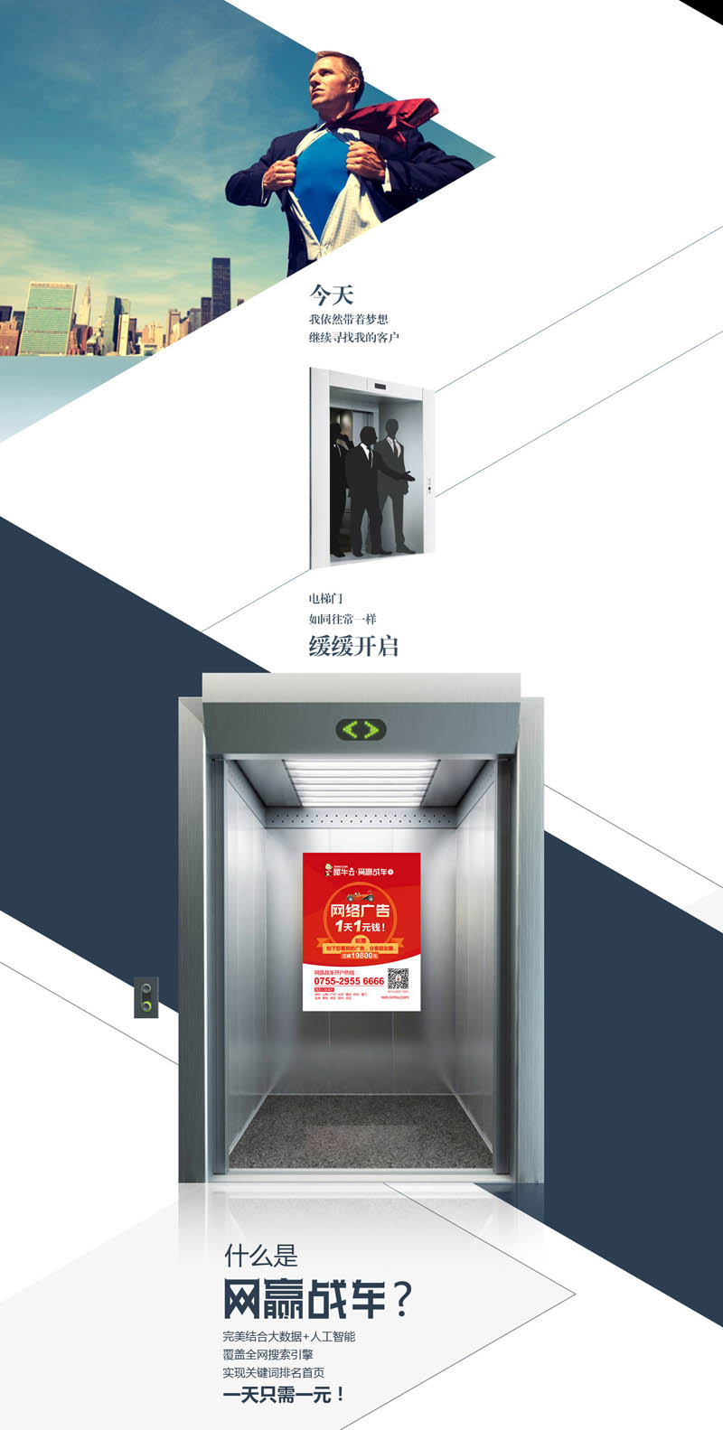 以往,你寻找客户,你会看黄页、你会收集名片、你会参加各种各样的展览会、展销会、你会去敲企业的门、你会塞宣传单张。现在,你想获得客户,你可以选择在搜索引擎上做你的关键词排名优化。你的梦想,基于你的选择,而绽放得更高、更大、更美。犀牛云网赢战车3.0通过电梯广告这个最传统方式告诉了你实现梦想的最新方式。