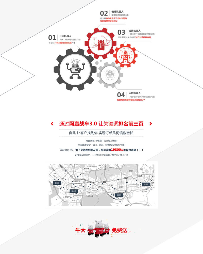网赢战车以中文分词与语义分析技术为核心,坐拥“云词、云链、云赞、云推广”4大人工智能算法机器人,实现人工智能与大数据的完美结合,帮助企业实现全网搜索引擎的关键词的免费排名。